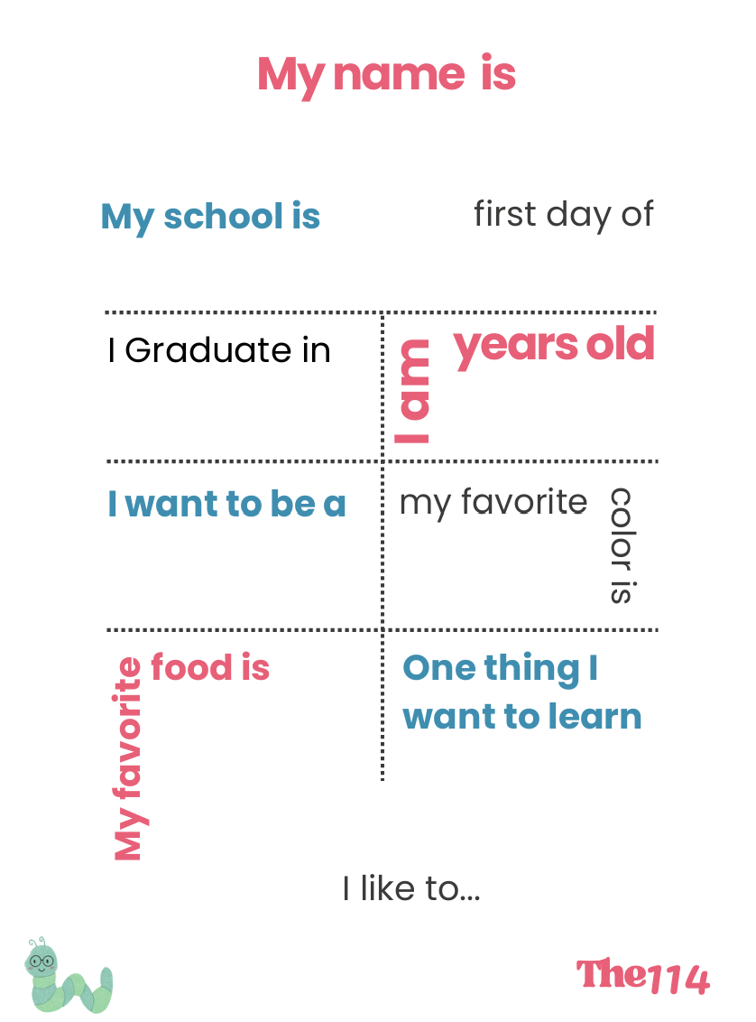 For a kids’ First Day of School memory sheet, you’ll want to balance fun, personal details with milestone markers so parents and kids can look back and see how much they’ve grown.